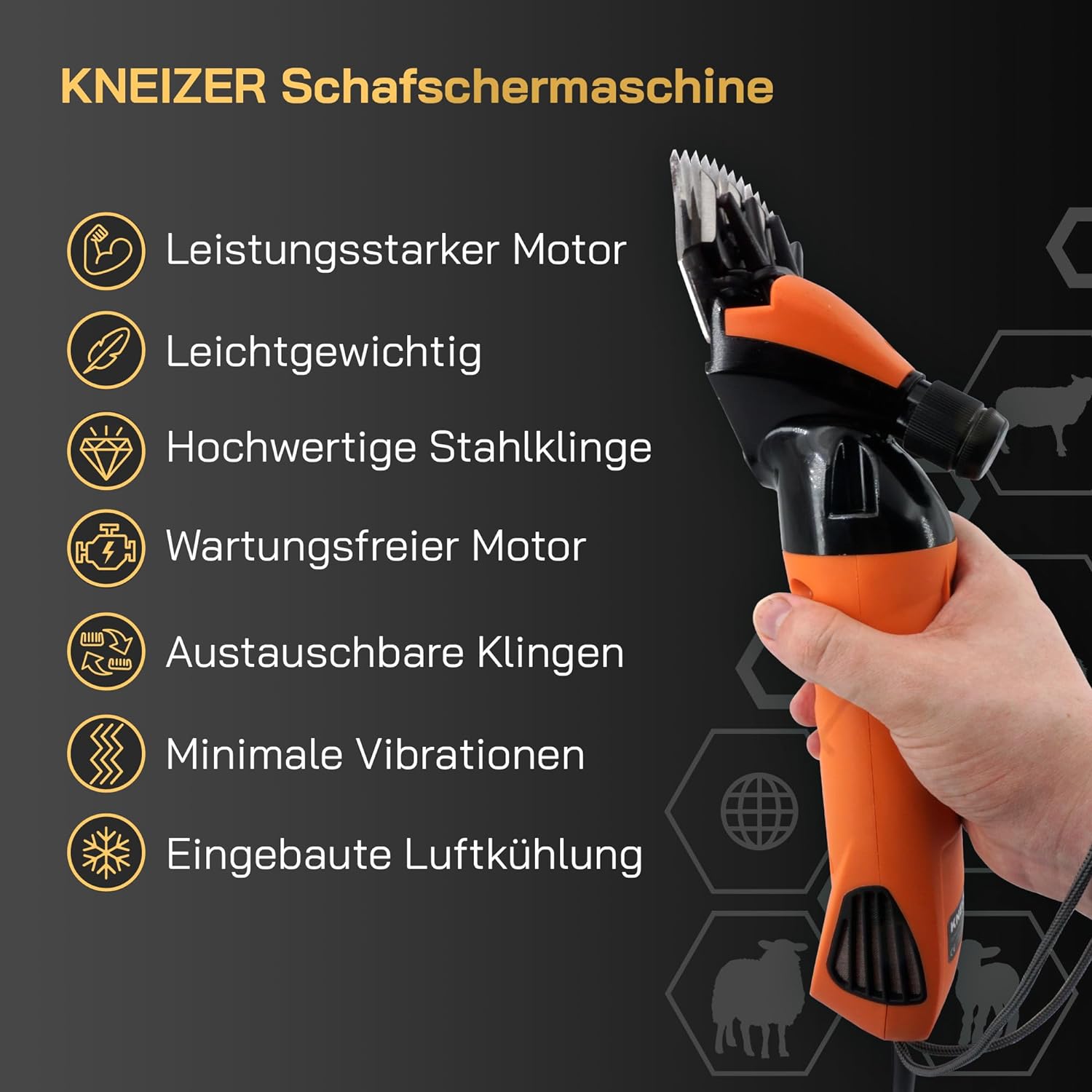 - Leistungsstarker und zuverlässiger Motor - Die Kneizer S-PRO-400 Schafschermaschine verfügt über einen leistungsstarken 200W Motor, der mit einer herkömmlichen 400W Maschine vergleichbar ist. Dies gewährleistet eine effiziente und schnelle Schur, selbst bei großen Mengen von Schafen. Dank der fortschrittlichen Motortechnologie bleibt die Maschine kühl und wartungsfrei, sodass Sie den ganzen Tag ohne Probleme scheren können.